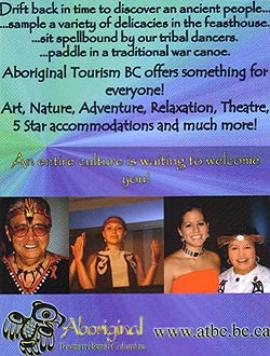 | Aboriginal Tourism BC Drift back in time to discover an Ancient people...sample a variety of delicasies in the feast house...sit spellbound by the tribal dancers...paddle in a traditional ware canoe. ATBC offers something for everyone www.atbc.bc.ca |
